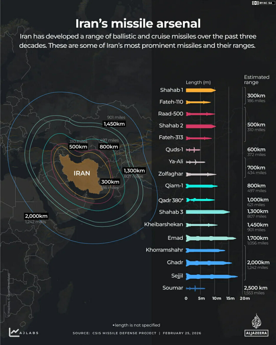 Prema procjenama, Iran raspolaže najvećim i najraznovrsnijim raketnim arsenalom na Bliskom istoku, s hiljadama balističkih i krstarećih projektila koji mogu pogoditi ciljeve daleko izvan svojih granica, uključujući Izrael i dijelove istočne Evrope.