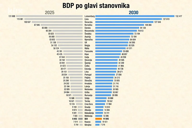 Za našu državu, MMF-ovi podaci za period do 2030. godine donose ohrabrujuć, ali suštinski usporen trend rasta. BDP po glavi stanovnika u BiH (prema tekućim cijenama) u 2025. godini iznosi oko 10.700 dolara, dok po paritetu kupovne moći on premašuje 24.000 dolara. Do 2030. godine očekuje se nastavak blagog rasta ovih parametara.